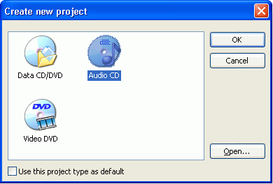 Of course, we want to create an Audio CD, so choose Audio CD as the type of the new project. |
