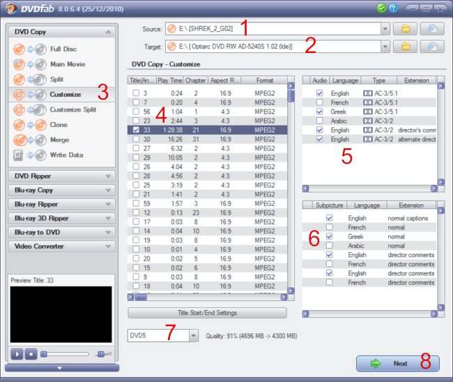 Next we need to select which videos (4) we need to include. Always select the one with the biggest length as it contains the main movie. If you want to keep any extra videos but you don't know which is what, simply select them and use the small preview player in the left bottom. Afterwards select the Audio (5) and Subtitle (6) tracks that you want to keep. Make sure DVD5 is selected in the drop down menu (7) and check the Quality value. If it is under 80% I suggest removing some more video or audio tracks. Click Next (8) to move to the next step. |