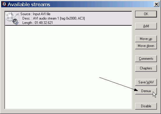 Time to extract (demux) the AC3 audio from our files. To do that go to Streams -> Stream List. You should see an AC3 audio stream. Click Demux to save it in the hard drive. |