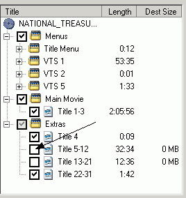 Here is area 1 of ratDVD. Here you can select the various titles of the DVD and select which to keep, edit or remove. For example here I have selected both the menu and the movie, but I removed 2 big videos of the extras which I don't need. Keep in mind that when you select a title or the whole area of the DVD (ex Main movie or just a title of the Main Movie) you can change the appropriate settings in area 2, which we will explain right now, in the next step!